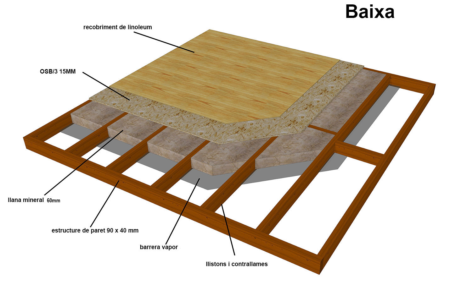 Lea Aïllament GENERAL: paret perifèrica 40 mm, coberta 60 mm, Baixa 60 mm, Tota la fusta autoclau exterior de color marró classe 4, Tots els materials de fusta interior tractada amb saturador incolor , Fusteria de fusta, Terra d'OSB cobert amb parquet imitació linòleum, Doble vidre